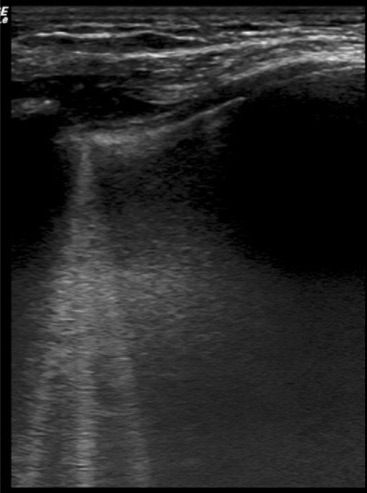 The main findings are the comet tails. They are described as hyperechoic, with a narrow start from the pleuritic line, extending deeply in the lungs. It has been extensively studied for cardiogenic pulmonary edema and it is a sign of fluid accumulation in the lungs.