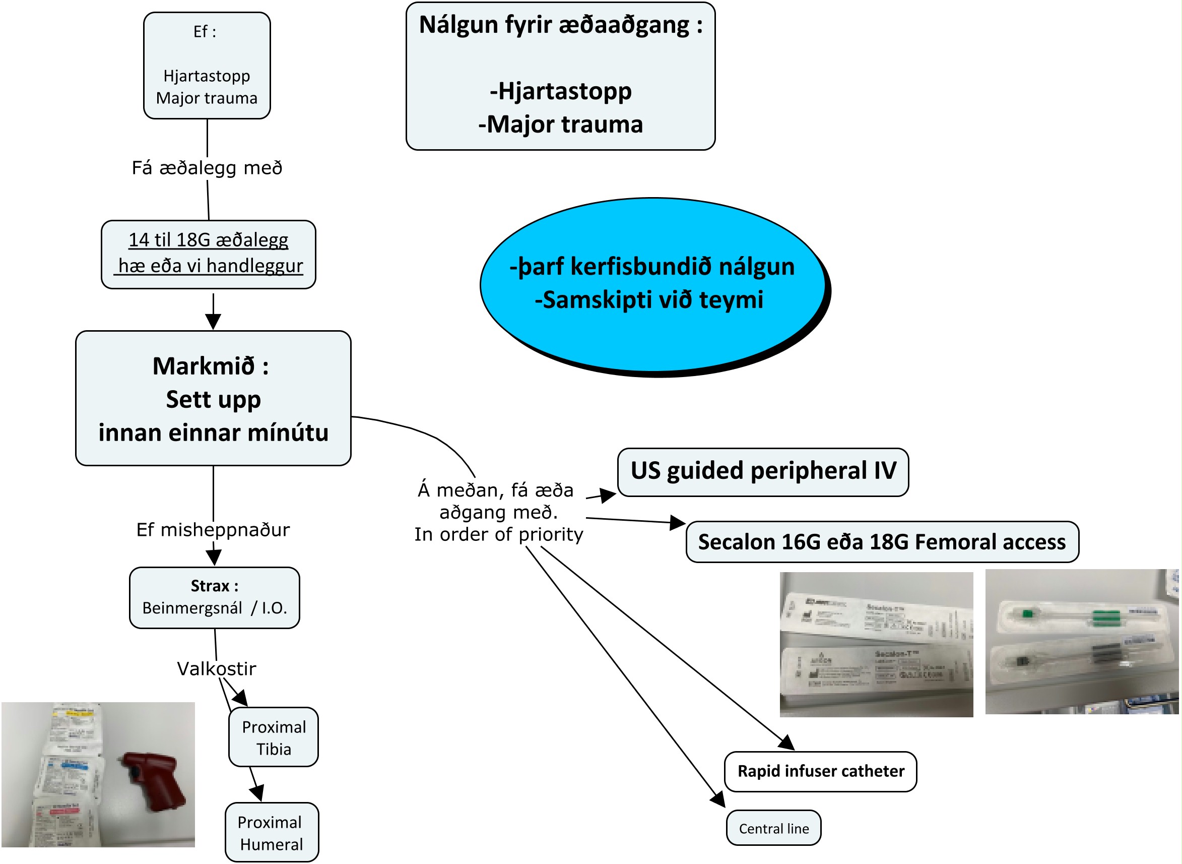 Einu sinni intraosseous er sett upp, annar fastur æðaaðgang ætti að vera sett upp. Valin eru : US-guided access, femoral Secalon access eða central line access.