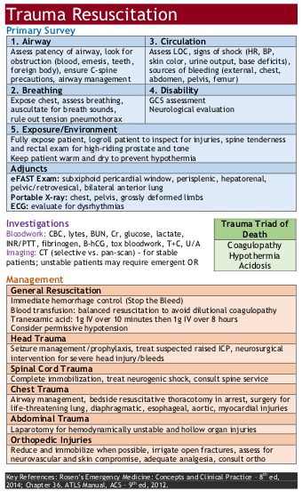 After a few months, you will dream of primary surveys. After a while, it should be engrained into the deepest parts of your brain. The ABCDE examination is a major part of emergency medicine and when things go to hell, we usually fold back to it or some version of it. We will focus on the primary and secondary assessments, the major concepts of trauma management, the equipment and where to find it.