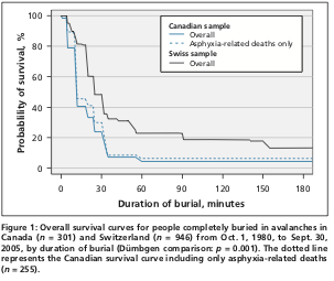 Graphic showing the probability of survival in function of the duration of complete burial.